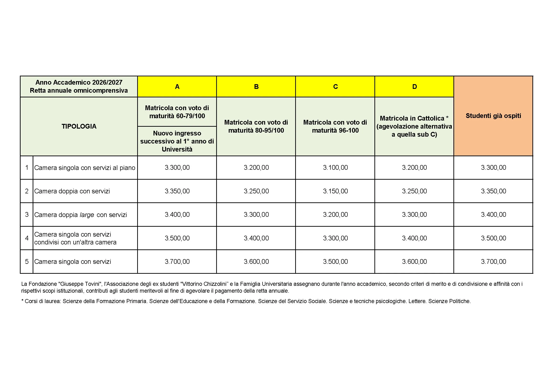 La retta annuale per l’anno accademico 2025/2026, con esclusione del mese di agosto, prevista per la residenza e i servizi offerti è: